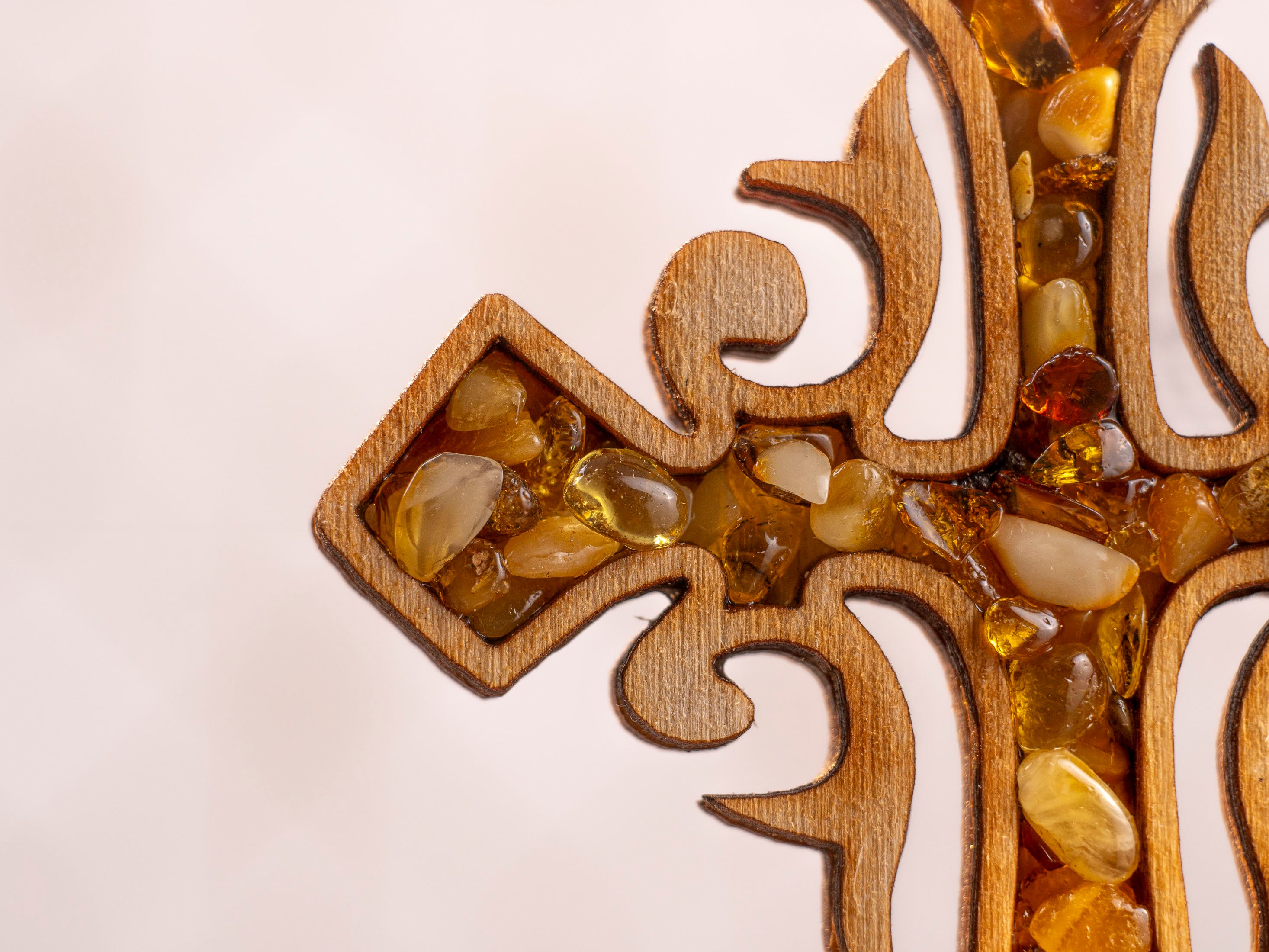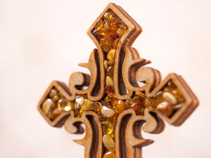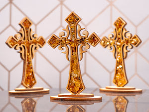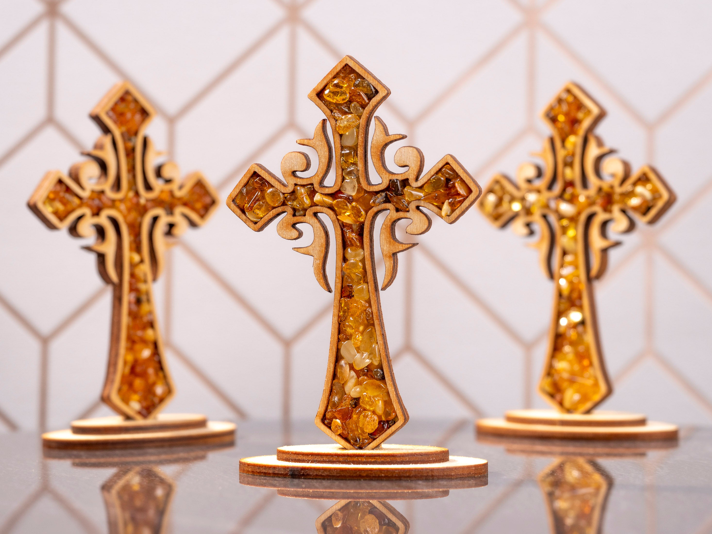 Enhance your home or church decor with this exquisite handmade Amber Cross Figurine. Crafted with care, this unique piece features a beautifully designed cross filled with rough, cherry-colored amber. The natural amber, known for its rich hues and organic textures, adds a touch of elegance and spiritual significance to this decorative item.