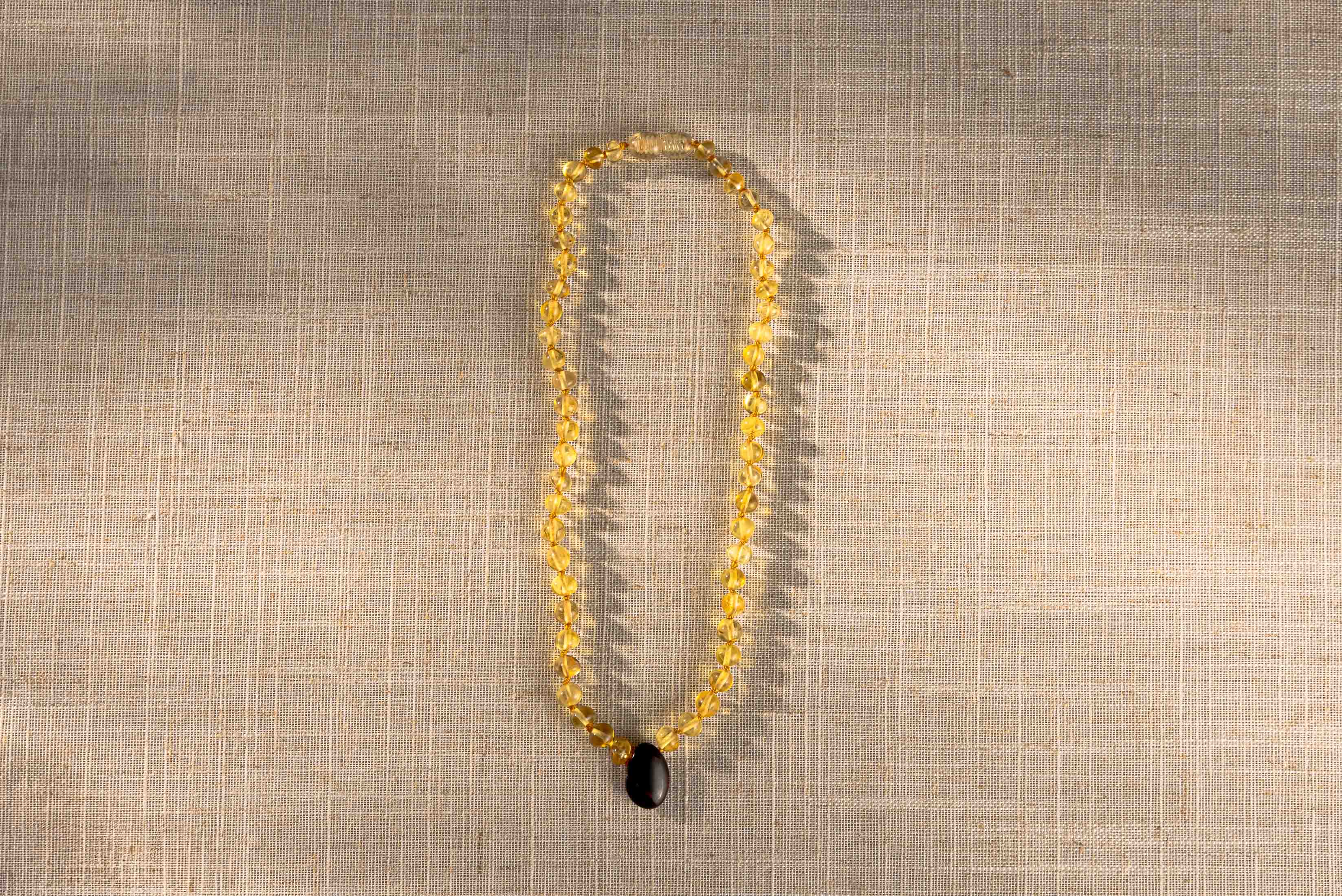 Rankų darbo iš 100 % gintaro karoliukų pagamintas vėrinys pasižymi žavesiu ir patogumu. Pagamintas Lietuvoje ir užsegamas vaikams saugia užsegimo sagtimi.